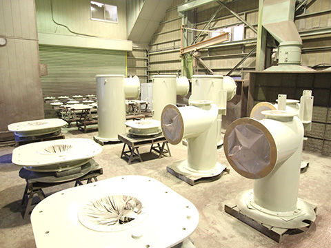前処理工場では、製品に付着した機械油や汚れを除去し、塗装にみあった下地(化成被膜)を合成します。 その上で防錆性の強い下塗り塗料を塗り、その後は塗装仕様書に基づき、中塗りや上塗りを決められた膜厚で塗り重ねていくことで、製品の性能保持力を高めます。 塗装しない箇所にはマスキングを施し、膜厚計で塗料の被膜の厚さを測定します。 |